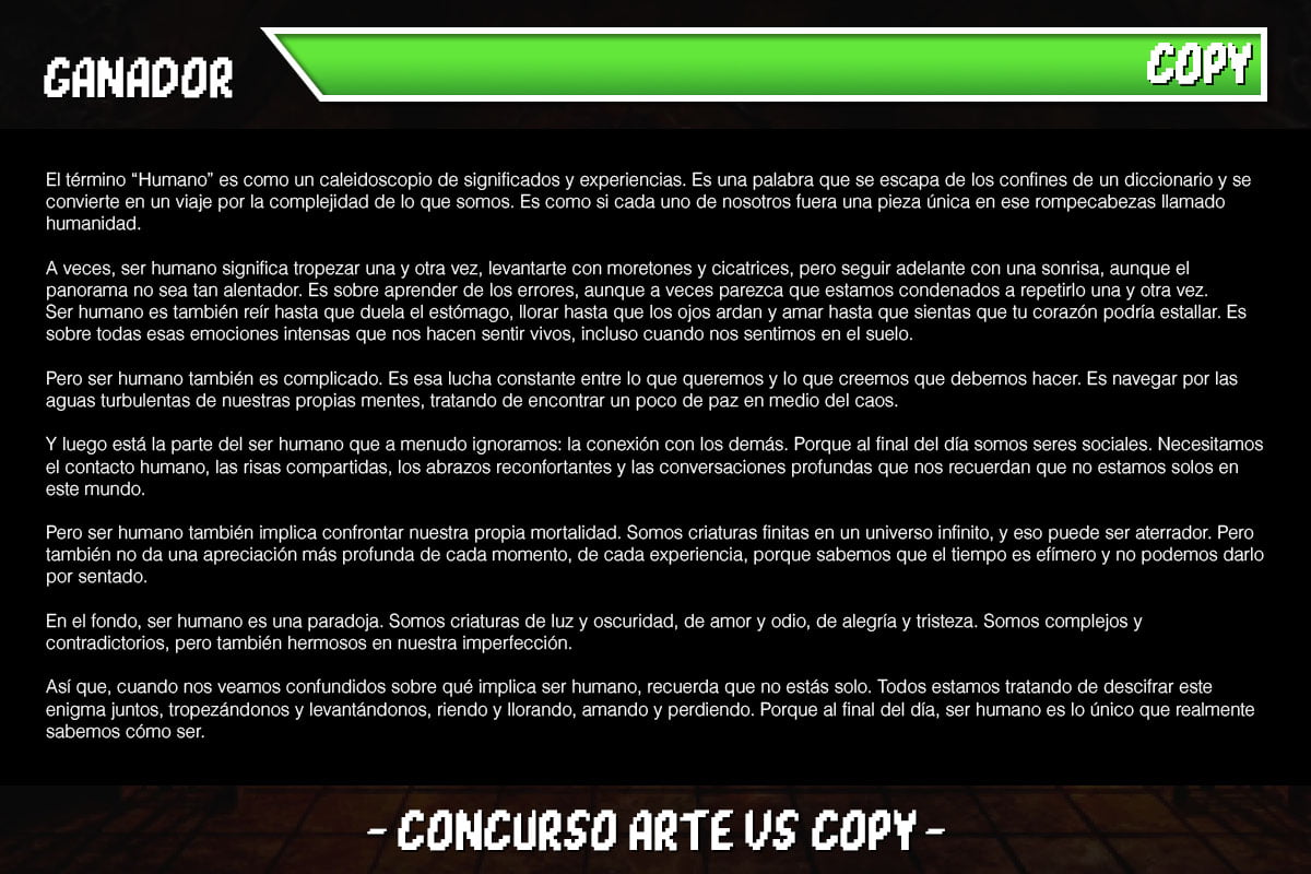 En el Concurso Arte vs Copy, l_s Copies han dejado claro que su lugar no solo está en el podio, sino en la cima de este Ring de la Creatividad en el que la premisa era representar el concepto Humano.